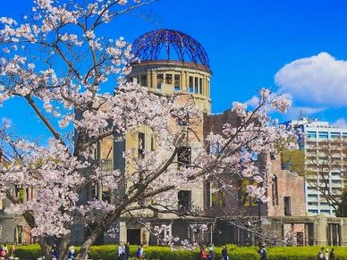 Hiroshima's cherry blossoms peak from late March to early April at iconic spots including Peace Memorial Park (300 trees symbolizing renewal), Hiroshima Castle (450 trees with traditional moat views), Shukkeien Garden (200 trees with evening illuminations), Hijiyama Park (1,300 trees on a hilltop), and nearby Miyajima Island (1,900 trees around Itsukushima Shrine's vermillion pagoda).